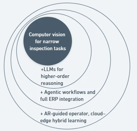 At the heart of modern inspection remains computer vision. Today’s systems already handle part identification, configuration validation, surface anomaly detection, and OCR for markings. These are narrow, well-defined tasks that can be executed consistently at production speed. The foundation of any roadmap is to keep strengthening this layer with better data pipelines, synthetic augmentation, and faster retraining so that inspection keeps pace with high-mix, low-volume production.
