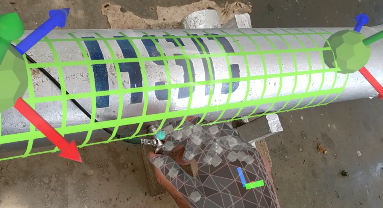 Another core capability of the Augmented Reality headset is the ability to overlay visuals on top of the physical world. Having triangulated geometry of the space and the ability to configure any digital shape through the AR headset allows technicians to create and manage the grid of any shape and size for their NDT job. Mesh of the environment will inform the location and shape of the asset while Interface controls will provide the flexibility of the grid format.