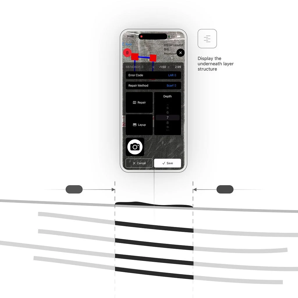 Accurate location unlocks real insights for repair teams. Every AR-anchored defect is automatically cross-referenced against the Layup Registration Table — the full ply stack at that exact surface coordinate. The system returns which layers are affected, their material and orientation, and a repair classification based on structural ply count. Engineers get a precise cross-section view without disassembly. Structural hits trigger automatic escalation.